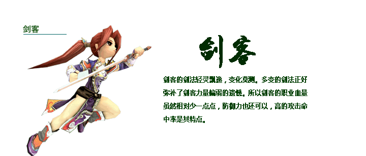 剑客职业来源于《漫画书》中的另一个主人公谭花磷,身怀剑皇所创的长白剑法,并继承了能够破除一切邪恶污秽之物的伏魔花灵剑。